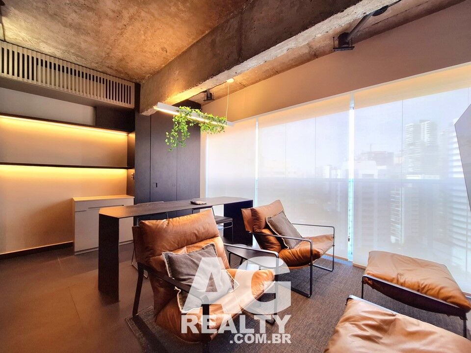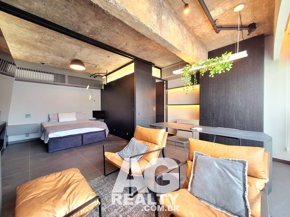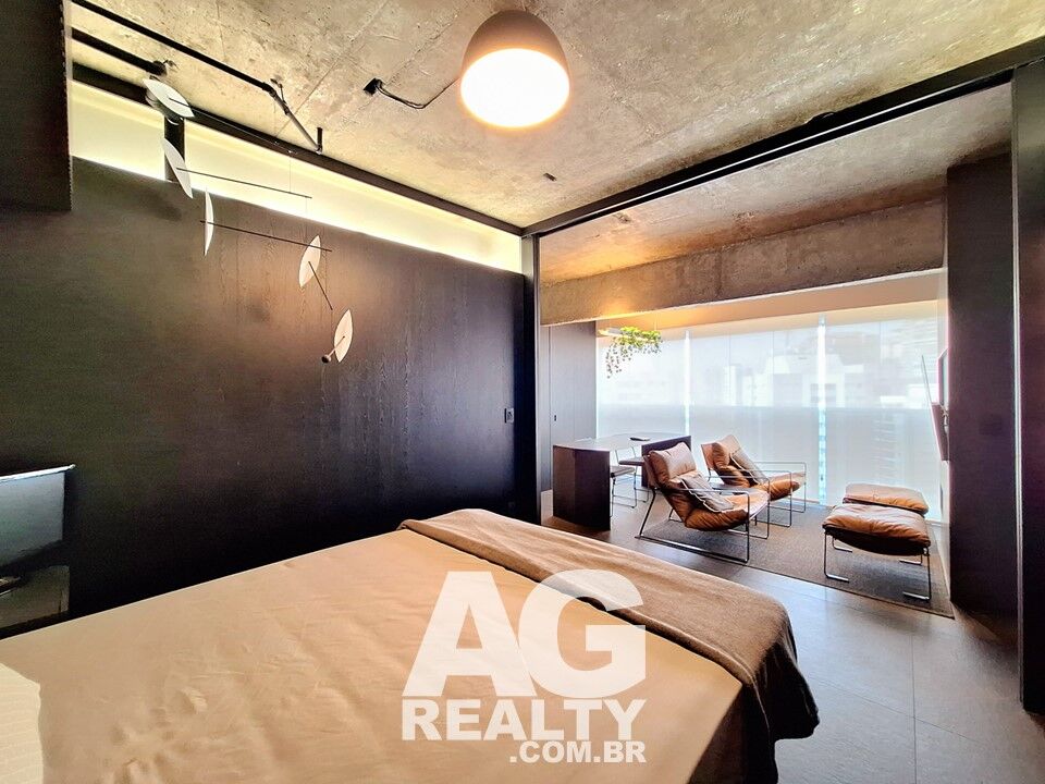 Apartamento mobiliado com reforma incrível, quarto com espaçoso armário, ar condicionado, persianas de enrolar, cozinha completa com geladeira, forno, lava louça e cooktop, banheiro e 1 vaga na garagem. Decoração em estilo industrial com móveis de alto padrão, espaços bem aproveitados com muita marcenaria, andar alto e ótima vista.